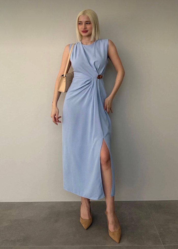 Pastel mavi renkte, drapeli detaylı ve yan yırtmaçlı kolsuz uzun elbise. Düzgün sentetik kumaştan, rahat kesim ve minimalist sokak stili sunar. Günlük kullanım için uygun. Marka tems