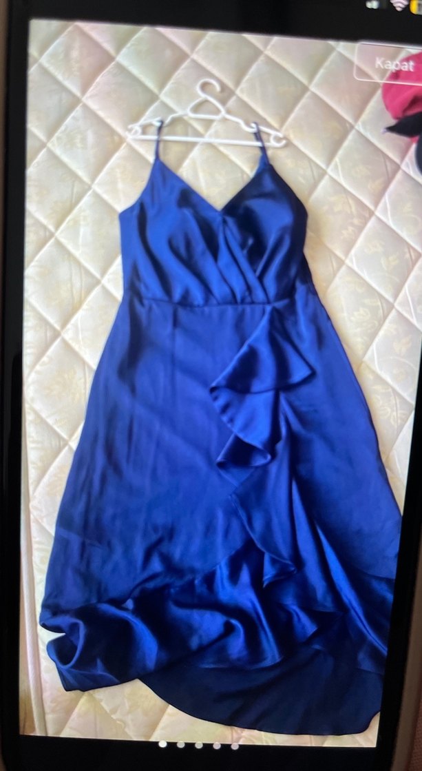Mavi, kolsuz, V yaka ve drapeli detaylara sahip, vücuda oturan midi uzunluğunda abiye elbise. Parlak kumaşıyla düğün ve şık sokak tarzına uygundur.