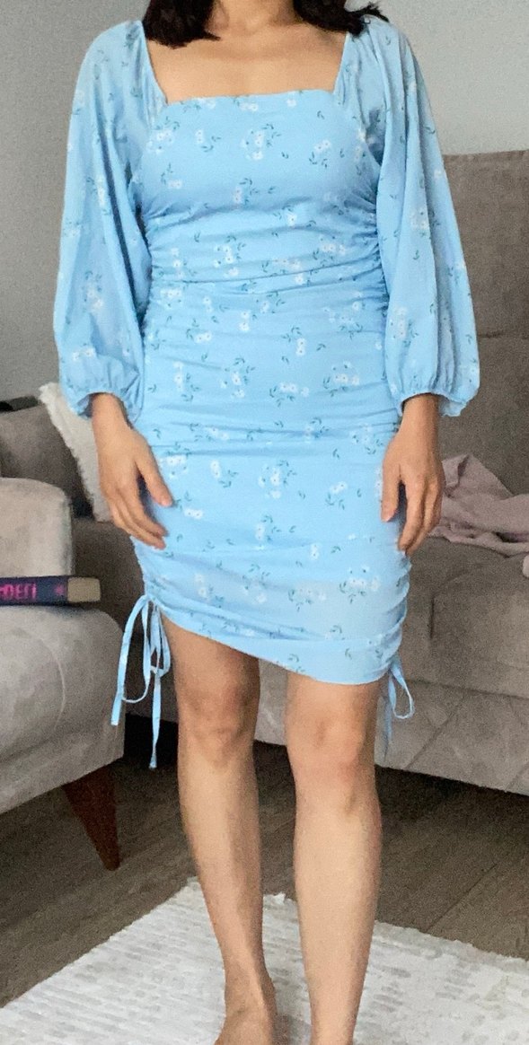 Drapeli tasarıma sahip, V yakalı ve askılı kolları olan, pastel mavi tie-dye desenli, yumuşak sentetik kumaştan yapılmış, vücuda oturan midi elbise.