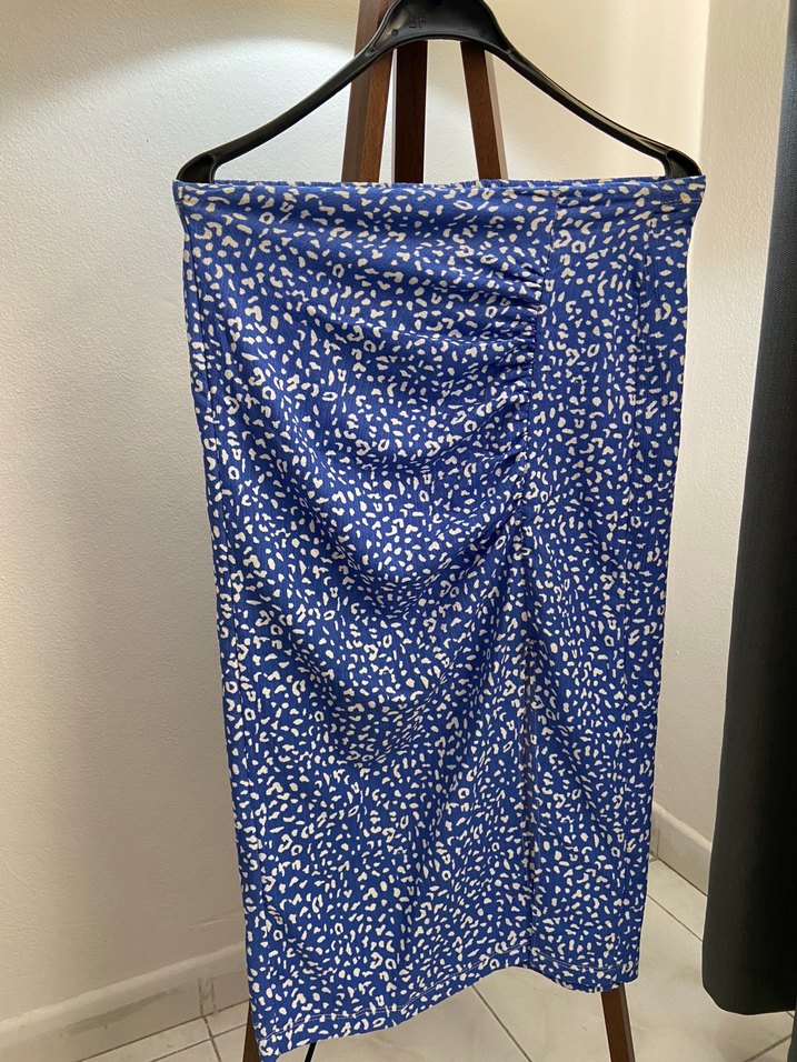 Mavi renkte, uzun ve vücuda oturan bu etek, drapeli tasarımı ve hafif batik deseni ile yumuşak sentetik kumaştan üretilmiştir.