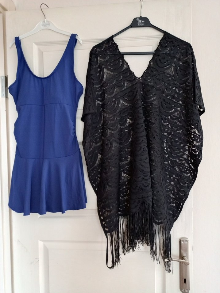 Mavi Drapeli Midi Kolsuz Mayo ve Siyah Püsküllü Örtü