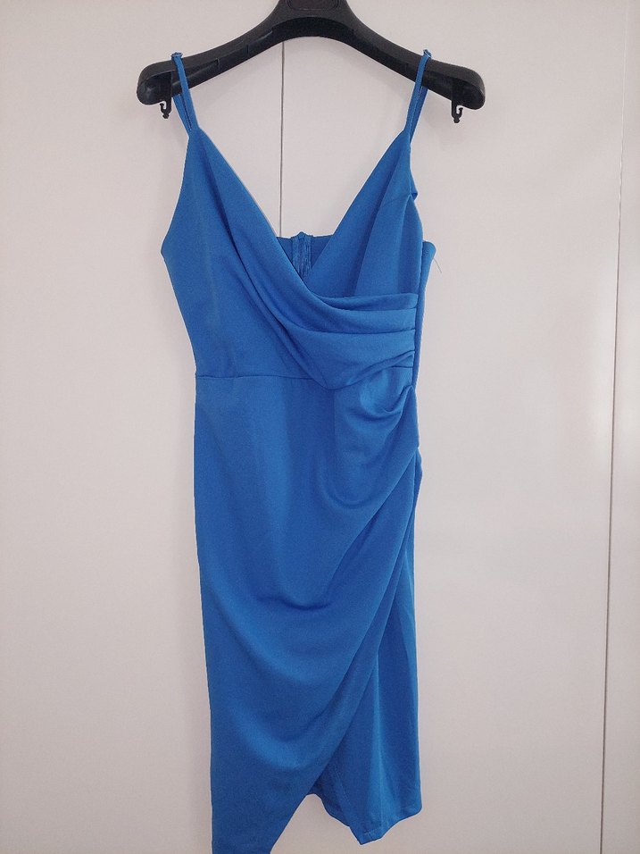 V yaka, kolsuz ve drapeli tasarıma sahip mavi mini abiye elbise, cesur ve çağdaş parti tarzı için uygundur. Rengi o kadar güzel ki her yerde dikkat çekeceksiniz.