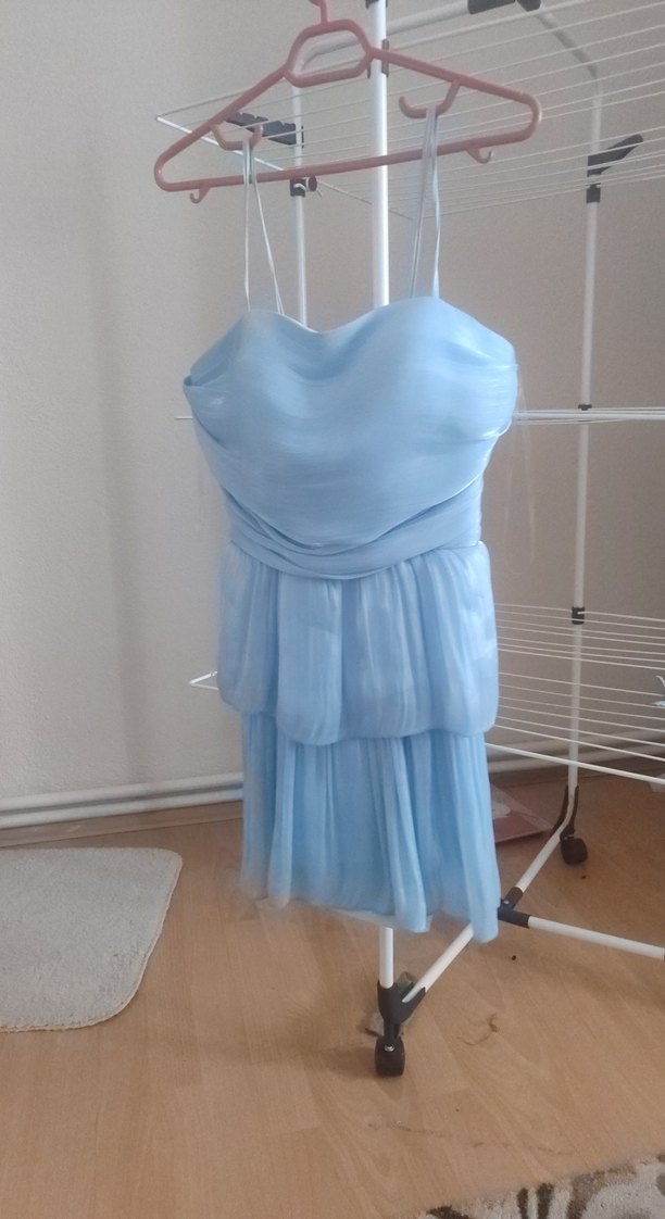 Pastel mavi renkte, askılı ve straplez kısa elbise, drapeli tasarımı ve vücuda oturan kesimiyle düğünler için uygundur. 36 beden boy 60 cm