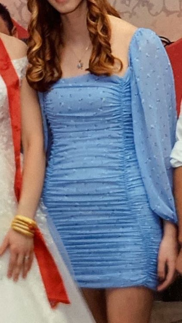 Bu mavi drapeli mini abiye elbise, straplez ve askılı kollara sahip, fit kesimlidir. Parti için uygun, gösterişli bir tarza sahiptir. ✨