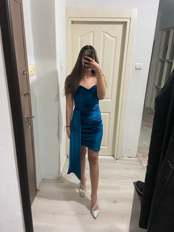 Mavi mini elbise, straplez yaka ve ince askılarla drapeli detaylara sahip. Parlak ve modern tasarımıyla romantik akşamlar için ideal.