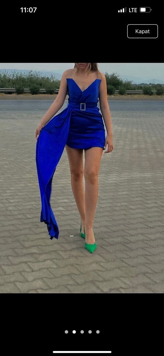 Parlak mavi kumaştan, drapeli detaylı, straplez ve askılı kısa elbise, parti için uygun.