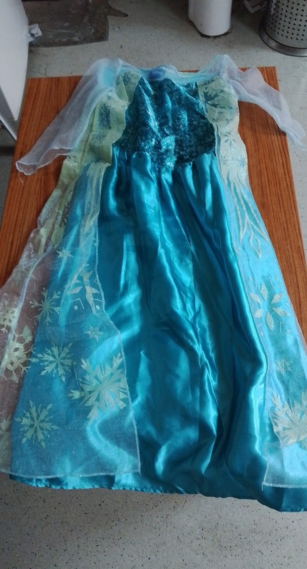 Drapeli, straplez, mavi parlak sentetik kumaştan yapılmış, nakışlı desenlere sahip, bohem tarzda, kolsuz ve vücuda oturan çocuk kostümü.
