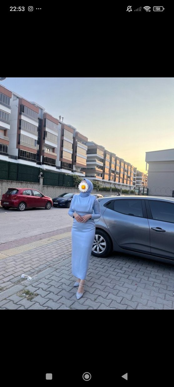 Pastel mavi renkte, yüksek yakalı ve uzun kollu, drapeli tasarıma sahip sentetik kumaştan yapılmış, dar kesim kiralık 1000 TL satılık 2200TL sıfırdan farkı yok bir defa sözde giyildi çok zarif sade bir abiye şal dahildir