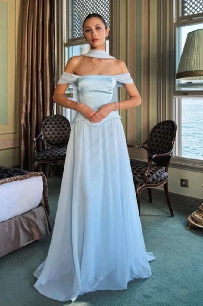 Pastel mavi renkte, drapeli ve straplez yaka detaylı uzun elbise. İpek gibi kumaştan, modern klasik ve düğün için uygun bir model. Açılma payı var 36 ya kadar olur✨