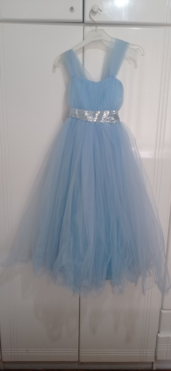 Pastel mavi renkte, drapeli ve straplez kesime sahip abiye. Sentetik kumaştan, kolsuz ve bele parlak kemer detaylıdır. 7 8 9 yaş uyumludur.