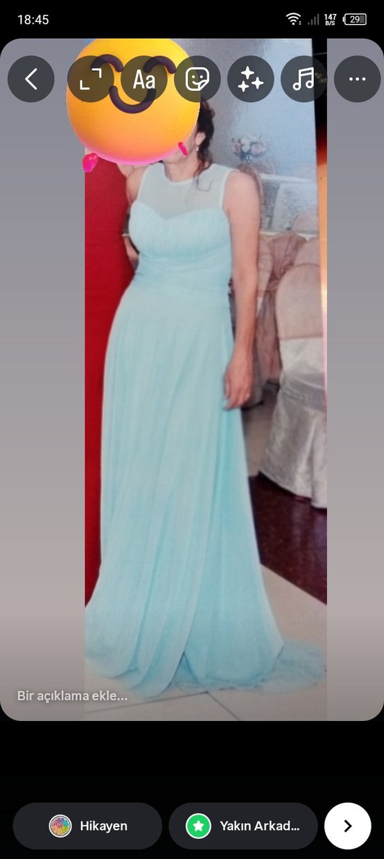 Uzun, fitted kesimli mavi abiye elbise, straplez yakalı ve drapeli tasarıma sahiptir. Pürüzsüz sentetik kumaştan üretilmiştir, düğün için uygundur. sadece bir kez giyildi 1,65 boyunda 7 cm ayakkabı ile giyildi