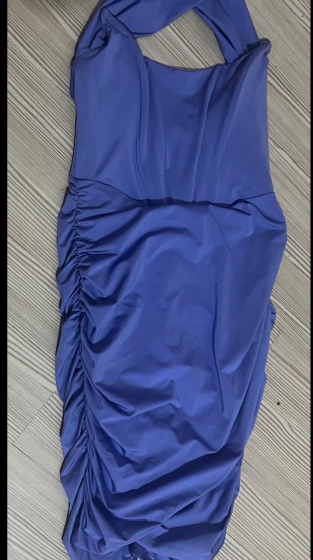 Mavi renkte, straplez ve vücuda oturan abiye elbise, drapeli detaylara sahip. Kolsuz tasarımıyla.