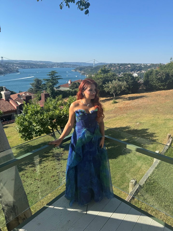 Mavi Drapeli Straplez Bohem Uzun abiye