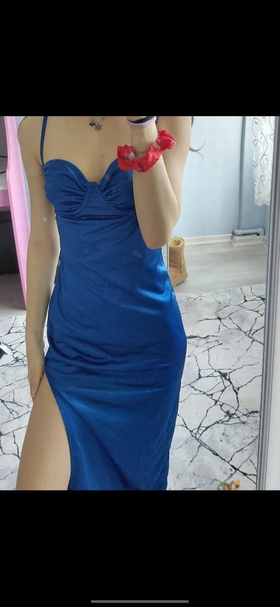 Mavi, drapeli ve straplez yaka detaylı, ince askılı, saten görünümlü, vücuda oturan midi elbise. Parti için uygun, gösterişli bir tasarım.