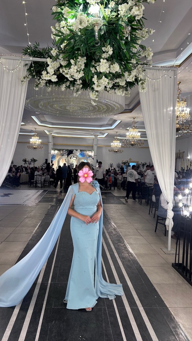 Bu pastel mavi uzun elbise, drapeli ve straplez kesimiyle şık bir görünüm sunar. Modern klasik ve avangard tarzı bir araya getirir, düğünler için uygundur.