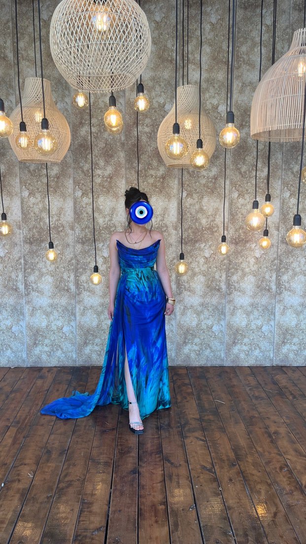 Straplez yaka, drapeli, uzun kesim İpeksi kumaş ve koyu mavi batik desenli, strappy kollu, düğün ve avant-garde tarz için uygun. 36-38 beden için uygundur. Alfabeta model benzersiz bir abiye #alfabeta #abiye #maviabiye #geceelbisesi #davetelbisesi