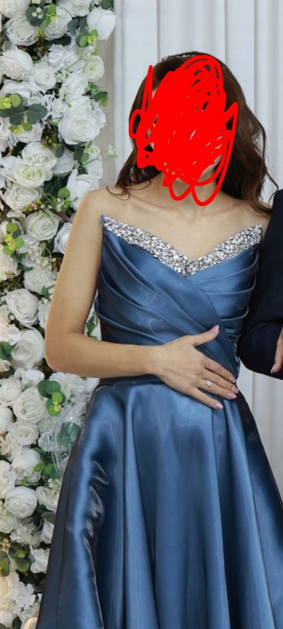 Mavi renkte, straplez ve drapeli tasarıma sahip, vücuda oturan uzun abiye elbise. Parlak yakası ve kolsuz kesimiyle modern klasik tarzda, şık bir seçim.