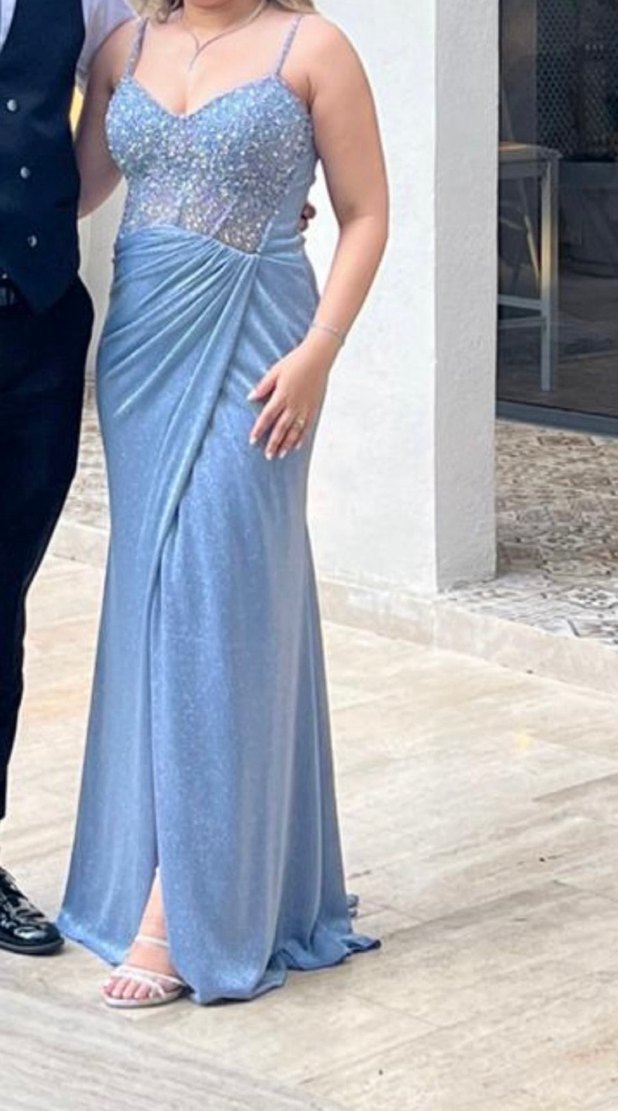 Mavi renkte, straplez ve drapeli tasarıma sahip, uzun ve vücuda oturan nişan elbisesi. 1 kez giyildi temizlendi So Lady marka tasarım elbisedir.