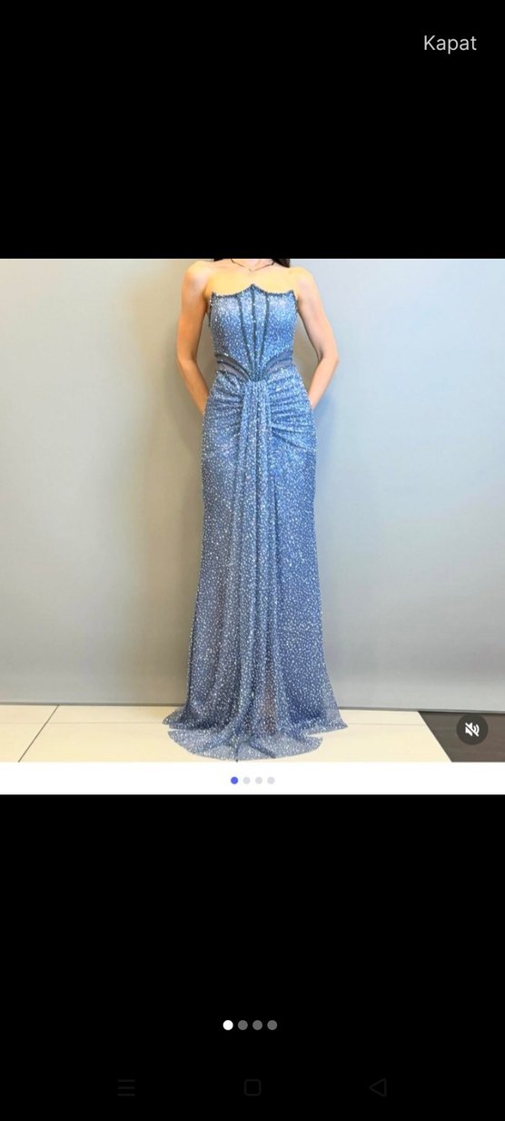 Bu dar kesim, straplez uzun abiye elbise, ışıltılı mavi kumaş ve drapeli tasarımıyla düğün ve özel etkinlikler için uygundur.