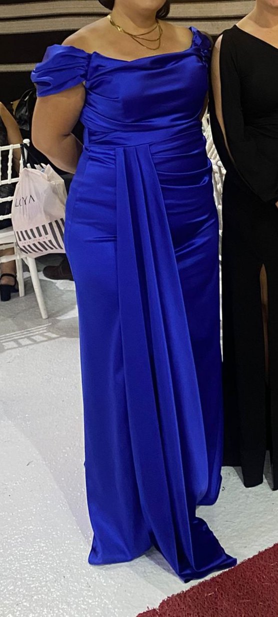 Parlak mavi kumaştan, straplez ve drapeli, uzun ve vücuda oturan abiye elbise. Düğünler için şık ve çağdaş bir seçim.