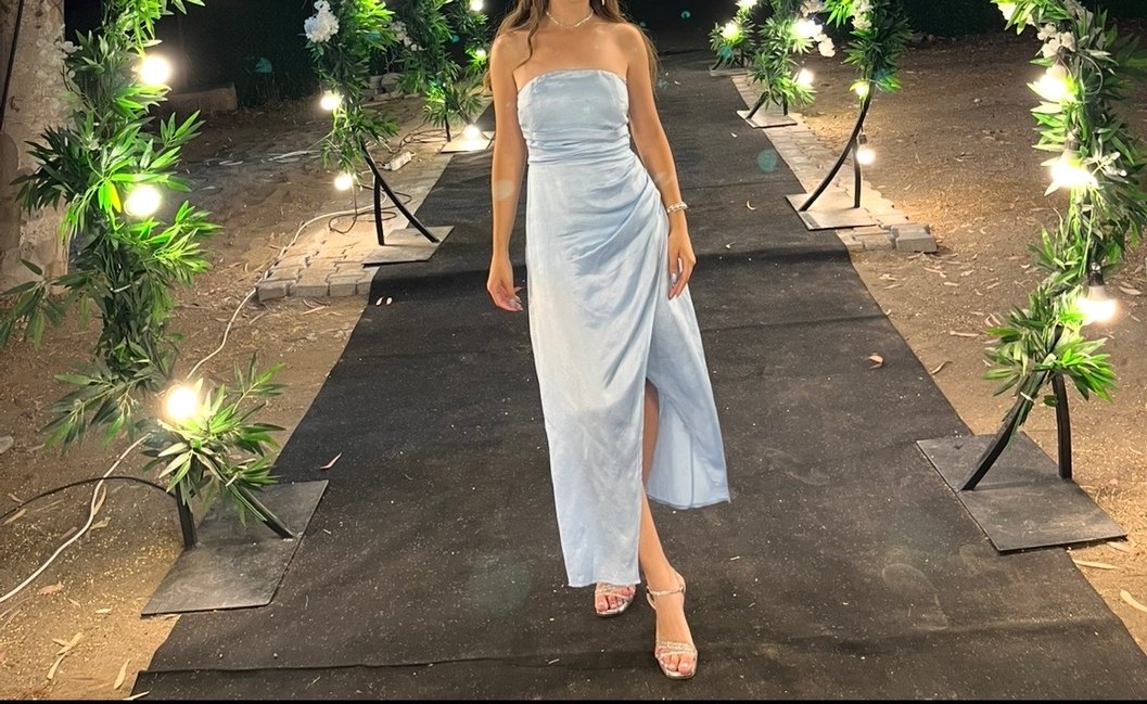 Pastel mavi renkte, uzun boy drapeli straplez abiye elbise. İnce askılı, klasik ve minimal tarzda, düğün için uygun, vücuda oturan model.