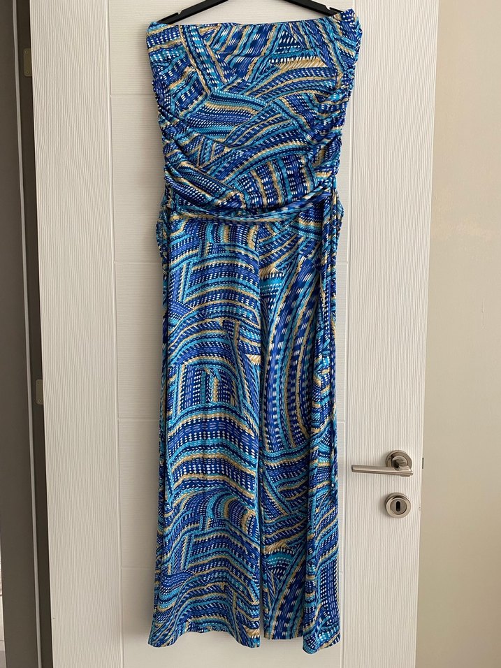 Drapeli, straplez ve fit kesimli uzun elbise, koyu mavi batik desenli ve yumuşak sentetik kumaştan. Bohem tarz için uygun.