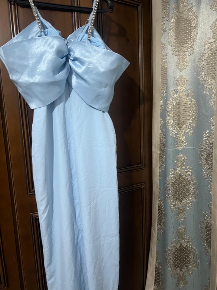 Drapeli, straplez, uzun ve pastel mavi renkte klasik şıklıkta, bohem Paris tarzı uyumlu elbise. Düğün gibi özel anlar için uygun, kolsuz ve vücuda oturan kesim.