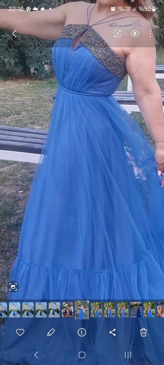 Mavi, straplez ve kolsuz elbise, drapeli tasarıma ve beli oturan kesime sahiptir. Uzun boyu ve parlak kumaşıyla bohem düğünler için uygundur. ✨sadece 1 kere giyildi