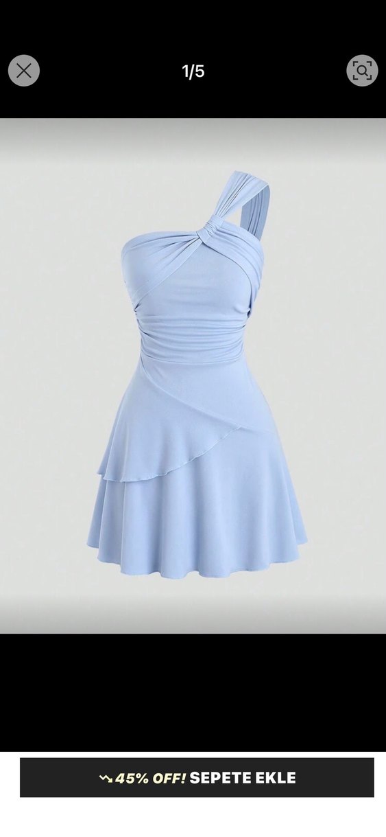 Tek omuzlu, drapeli ve mavi renkte olan bu dar kesim elbise, yumuşak sentetik kumaştan yapılmıştır. Minimalist ve çağdaş tarzda, parti için uygundur. Midi uzunlukta ve desensizdir.