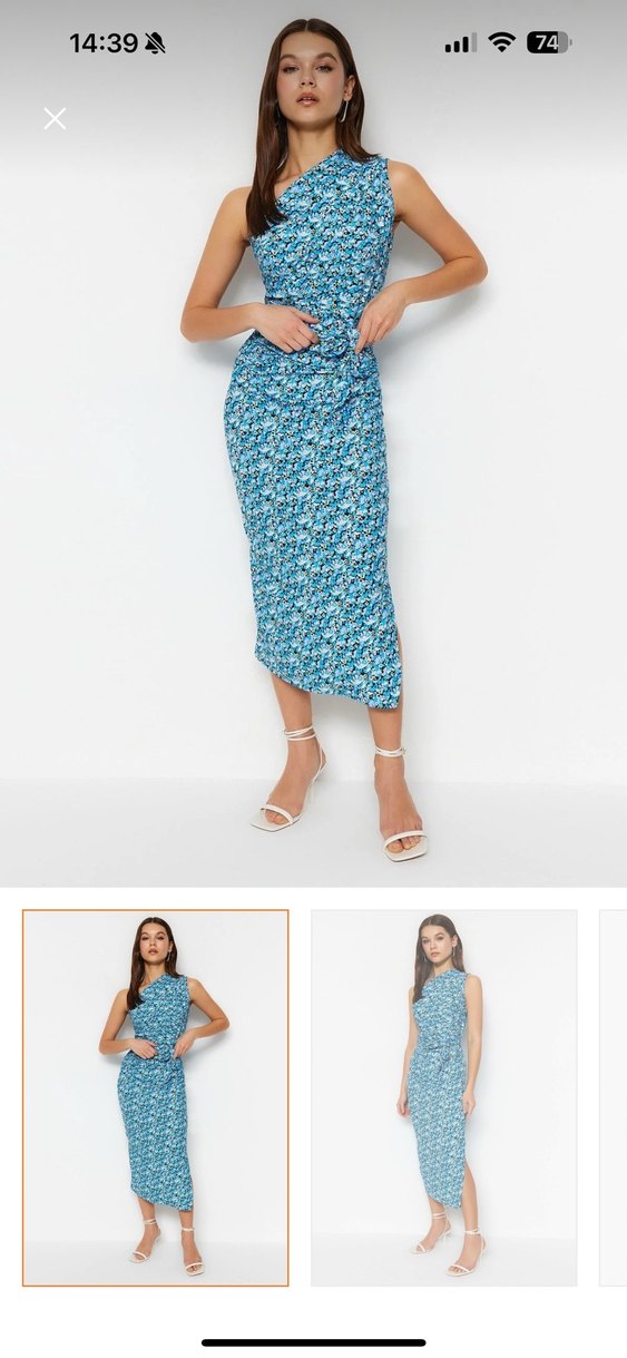 Hafif mavi batik desenli, drapeli, uzun ve vücuda oturan kolsuz elbise