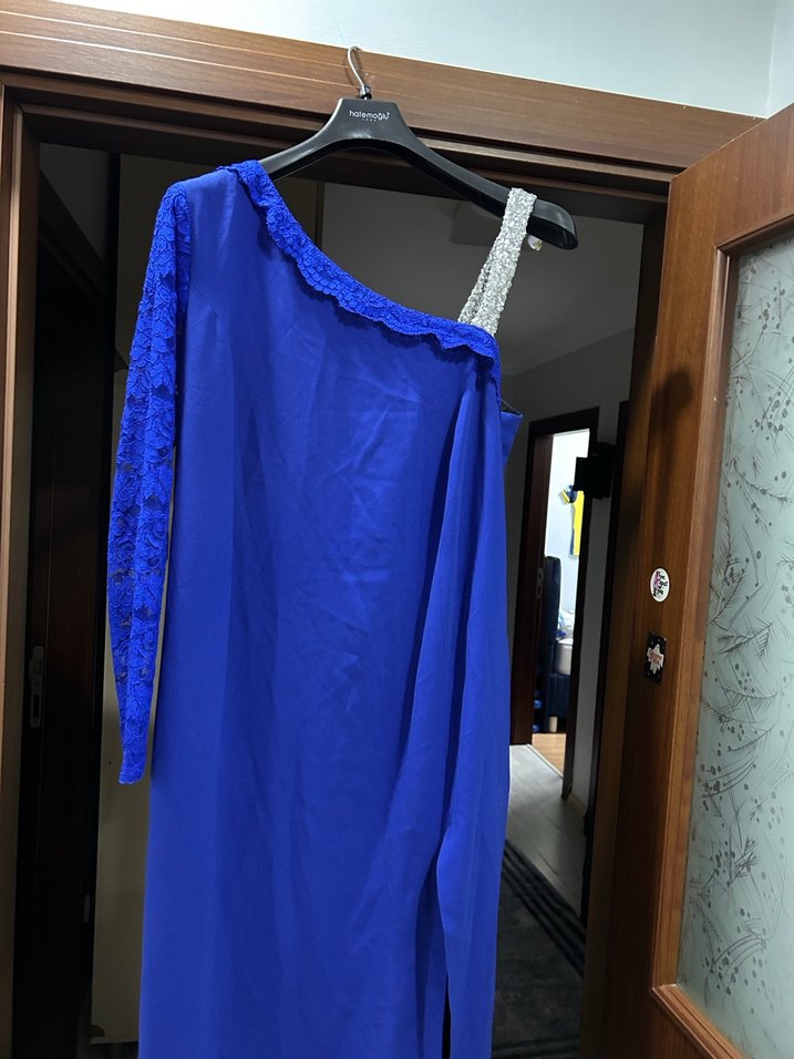 saks mavi renkli, drapeli ve bol kesim abiye elbise. Tek omuzda taşlı askı, diğer omuzda uzun dantel kollu, straplez yakalı ve uzun boyda. Minimalist ve çağdaş tarzda, düğün için uygun. yandan derin nir yırtmacı car isterseniz azaltabilirsiniz. özel dikimdir. koltuk altı 55 cmdir. bel 56 cmdir krep kumaştan astarlı dikişmiştir. 46 bedendir