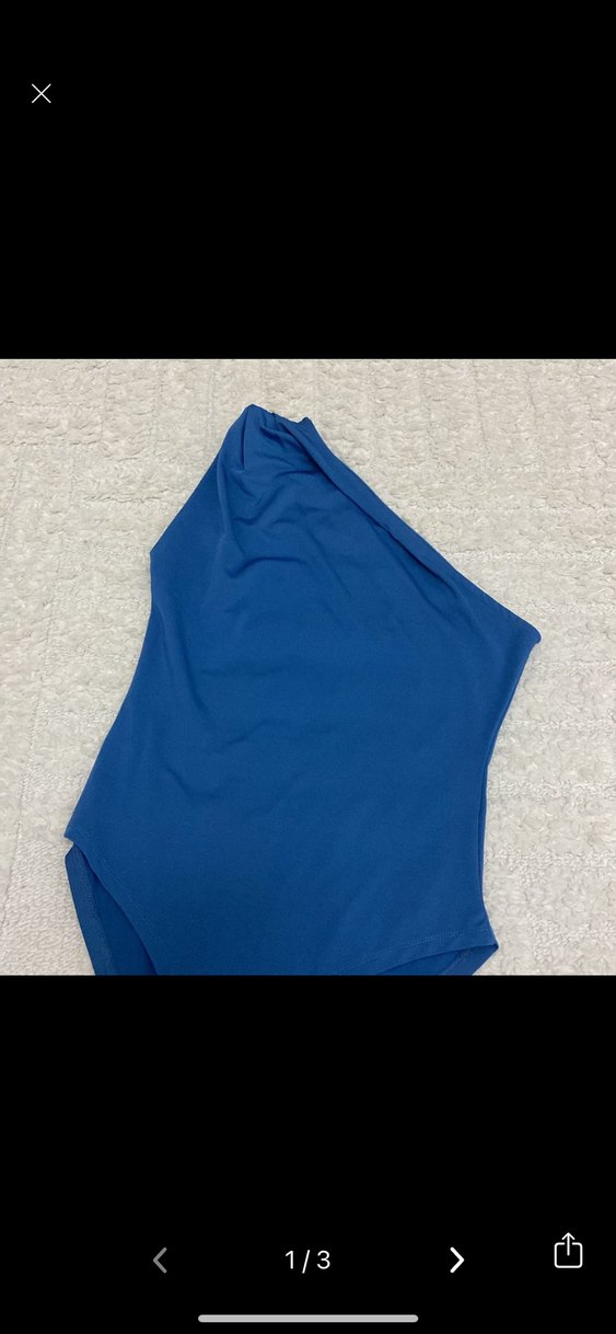 Mavi renkte, drapeli ve tek omuzlu, fit kesim kadın mayo. Düz ve desen içermeyen tasarımıyla outdoor kullanım için uygundur.