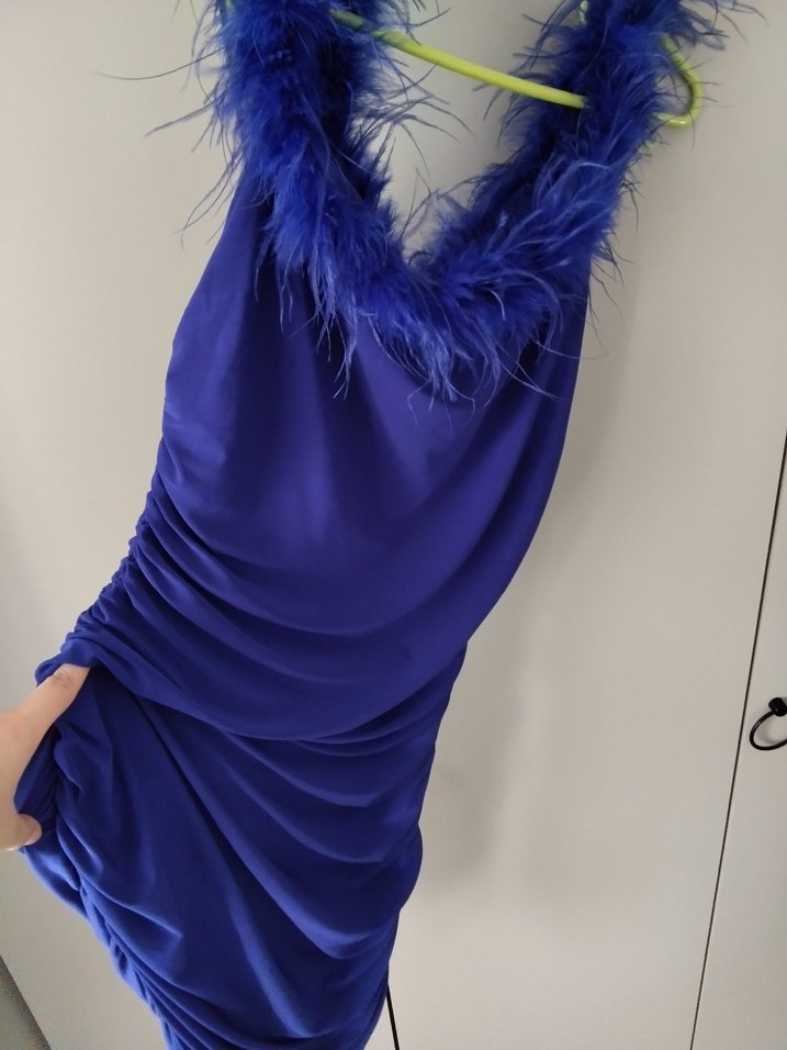 Mavi, drapeli ve tüylü detaylı straplez yaka, kolsuz, mino boy dar kesim abiye elbisedir. Parti için uygundur.