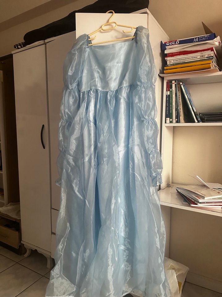 Pastel mavi, uzun boy, askılı kollu, drapeli detaylara sahip abiye.kolları katlı balon tül bebe mavisi abiye sadece bi kere giyildi.