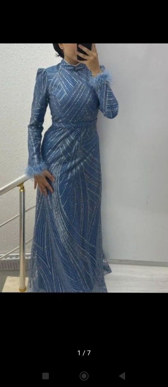 Uzun mavi abiye elbise, parlak batik desenleri ve drapeli tasarımıyla dikkat çeker. Uzun kollu, kayık yaka ve regular fit kesimlidir. ✨