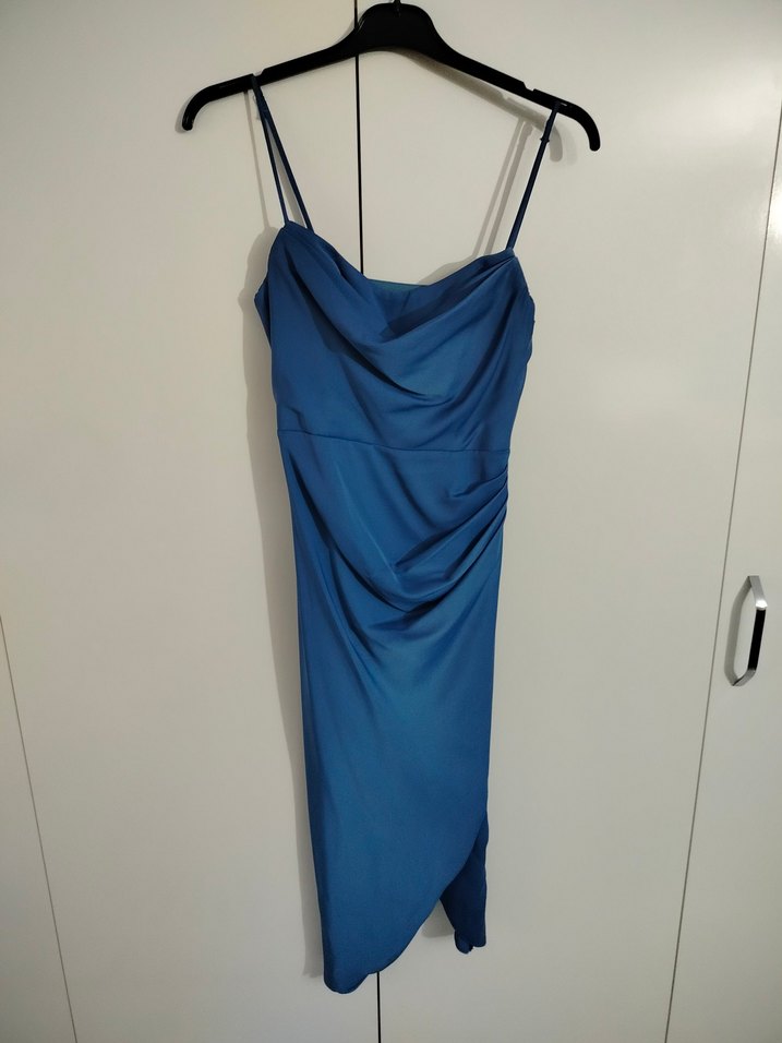 Drapeli detaylara ve ince askılara sahip, vücuda oturan koyu mavi uzun abiye elbise. Minimalist ve çağdaş tarzıyla parti için uygun.