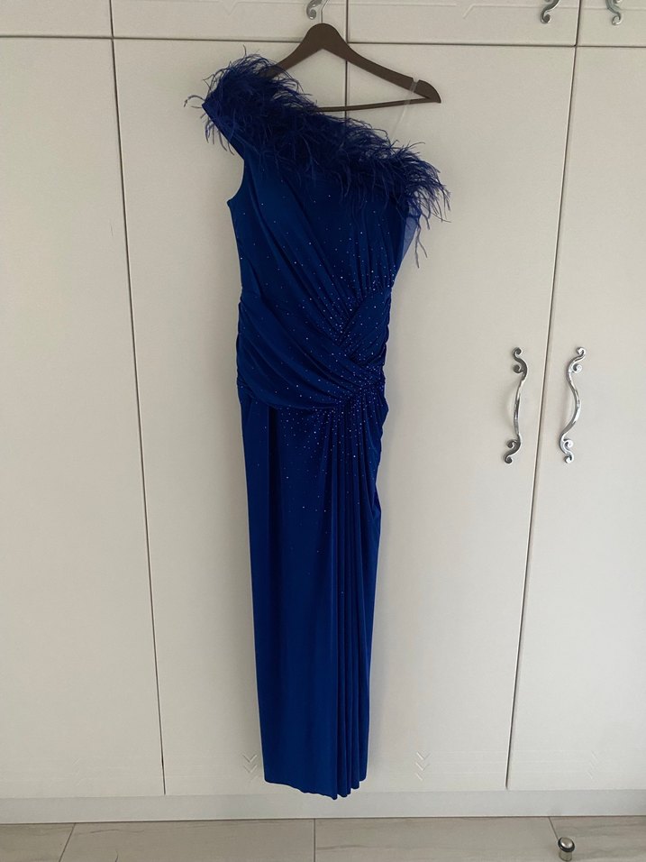 Bu mavi uzun abiye elbise, straplez ve drapeli tasarıma sahip olup tek omuzda tüy detaylarıyla klasik şıklık sunar. ✨