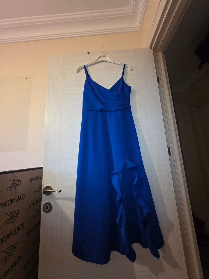 Parlak mavi renkte, drapeli detaylı, straplez ve kolsuz uzun abiye elbisedir. Minimalist ve çağdaş tarzıyla düğünler için uygundur. Marka: UMBAZA.