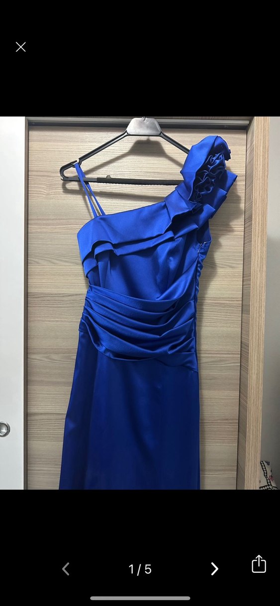 Mavi, drapeli ve straplez kesim uzun abiye elbise. İnce askılı, parlak kumaşlı ve vücuda oturan modern klasik tarzda.