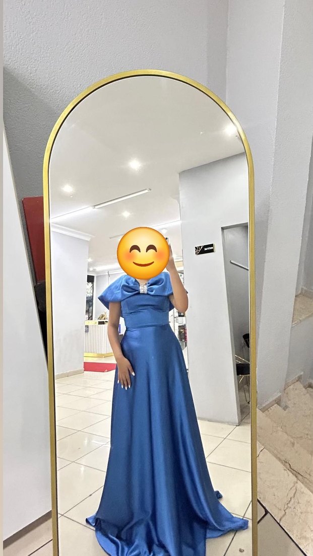 Parlak mavi renkli, drapeli ve baskılı uzun abiye elbise. Kısa kollu, kayık yaka ve klasik şıklıkla güncel tasarımda 1 kere kullanılmış