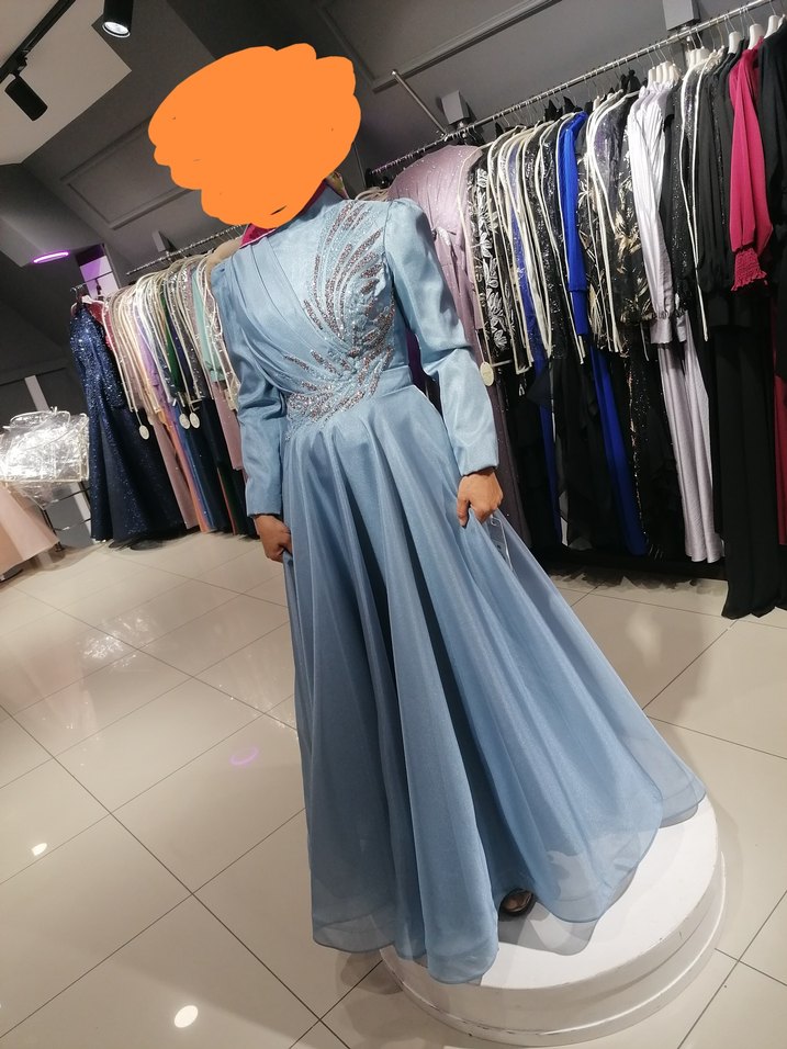 Pastel mavi, uzun kollu, yüksek yakalı, drapeli ve baskılı desenli, modest kesim abiye elbise. Düğünler için uygun şık model.