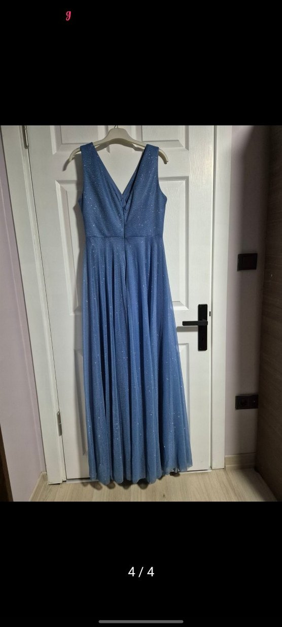 Drapeli tasarıma sahip, V yaka ve kolsuz, mavi parlak uzun abiye elbise. Düğünler için uygundur. parlak ve dökümlü
