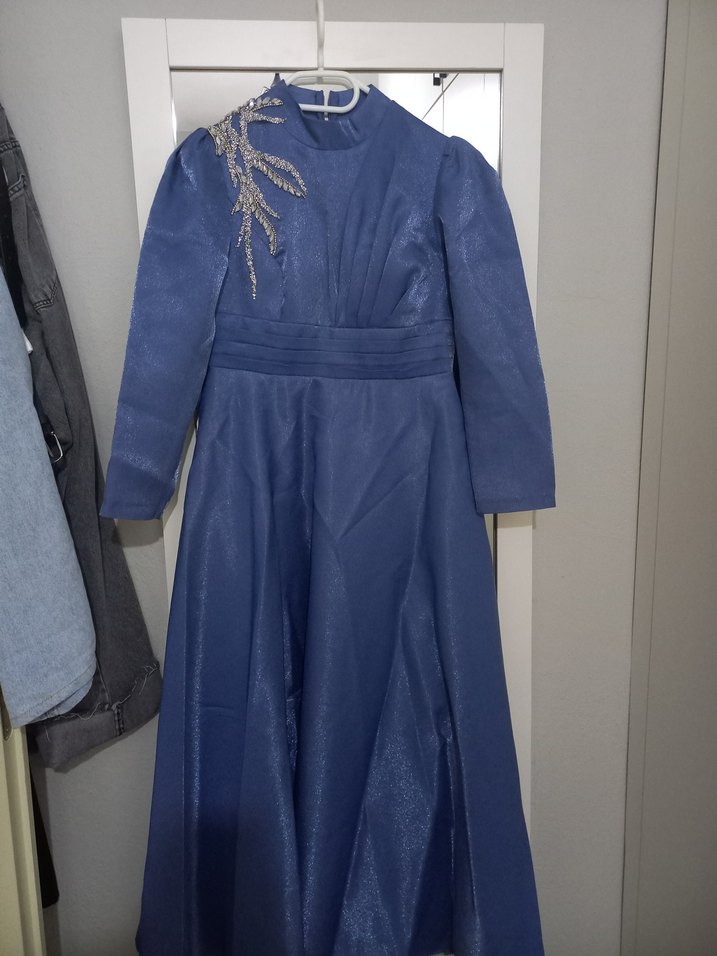 Parlak mavi uzun abiye elbise, drapeli tasarım, notalı yaka ve uzun kollu. Düzenli kesim, modern klasik tarzda, düğünler için uygun. ✨ Boy:140 cm
