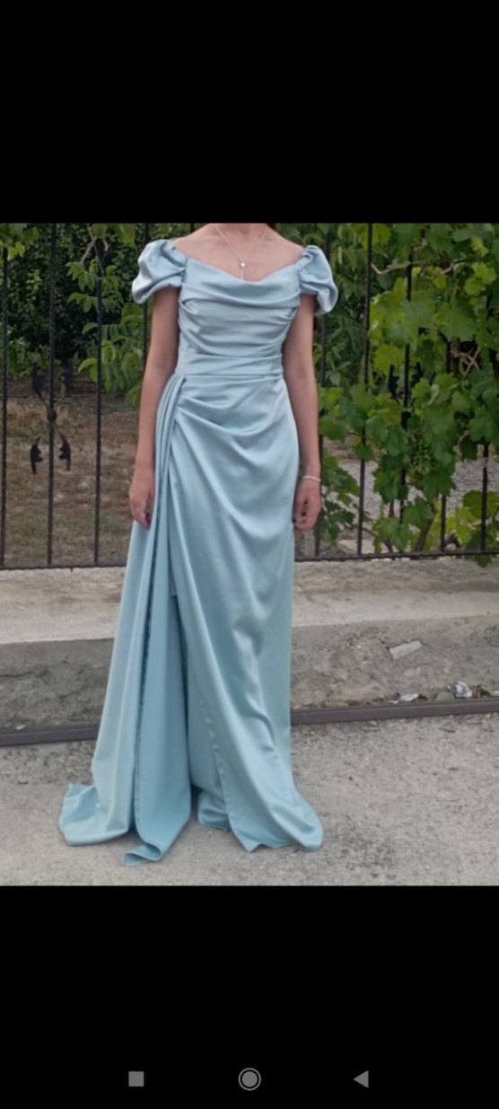 Pastel mavi renkte, drapeli uzun abiye elbise, straplez yaka ve regular kesim ile düğünler için uygundur. 38beden bana bol geldiği için arkalardan daralttim 50-55kgyd güzel olur bir kere giyildi