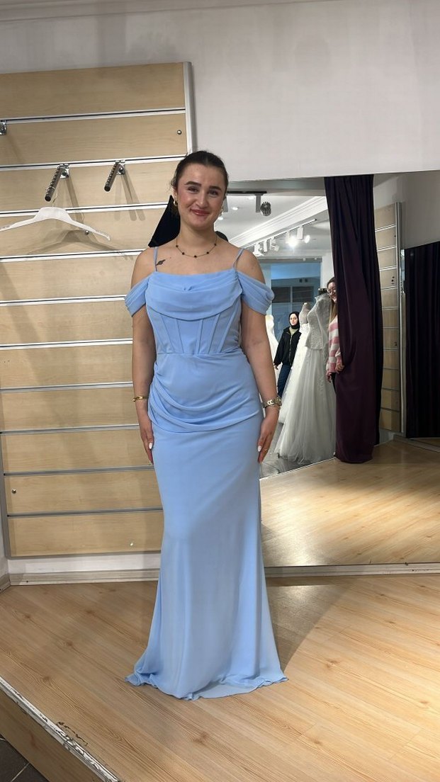 Pastel mavi renkte, drapeli ve askılı kollu, straplez yaka uzun abiye elbise. Regular kesim ve modern klasik tarzıyla düğünler için uygun bir seçenek.