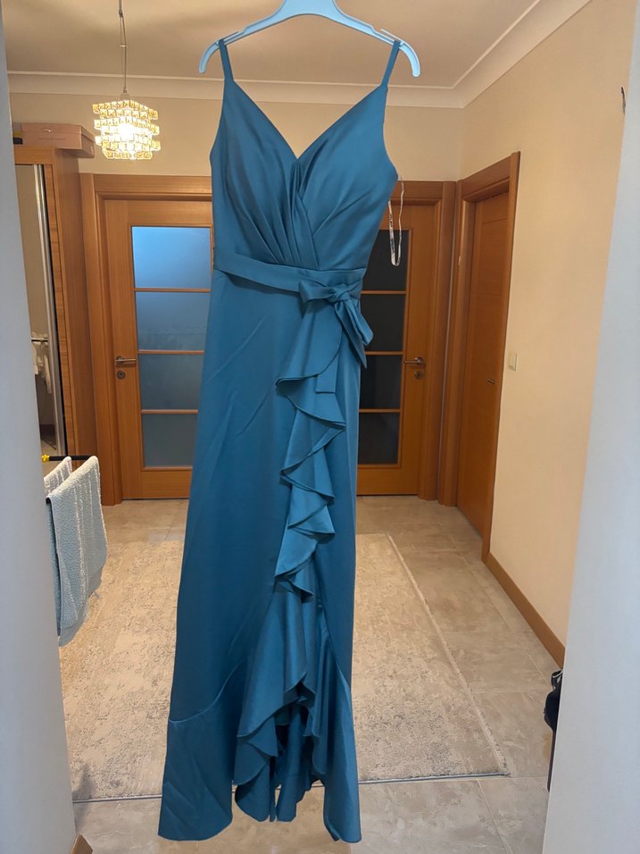 V yaka ve ince askılı, drapeli tasarıma sahip mavi uzun abiye elbise. Belden bağlamalı ve şık fırfırlı detaylarla düğünler için uygun.