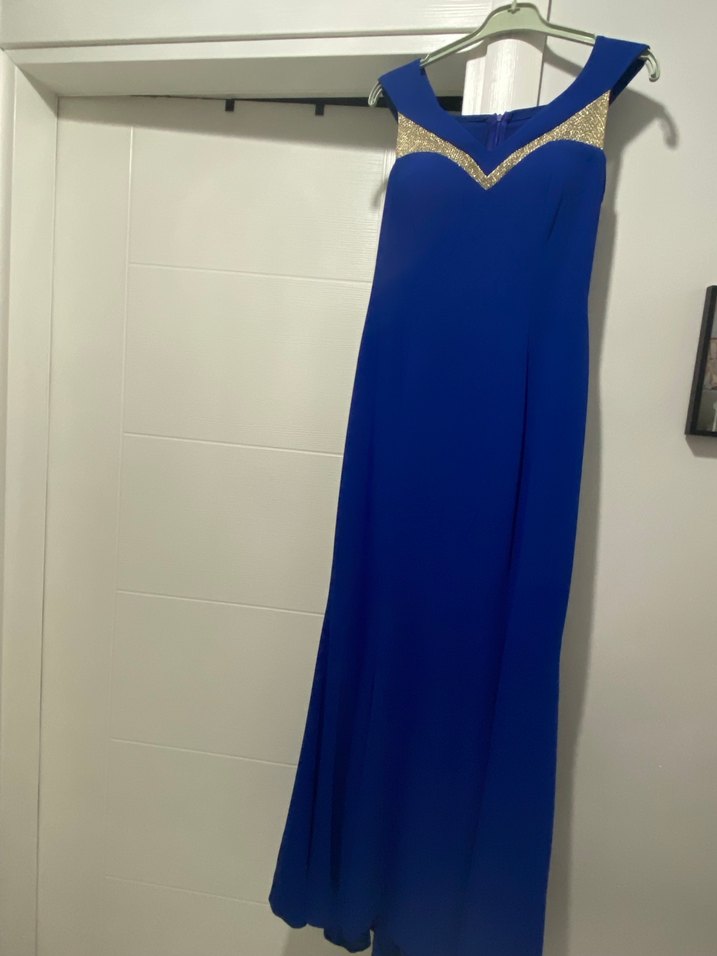Bu uzun mavi abiye elbise, V yaka ve parlak altın detaylarla drapeli tasarıma sahiptir. Kolsuz ve regular fit, modern klasik tarzda düğünler için uygundur.