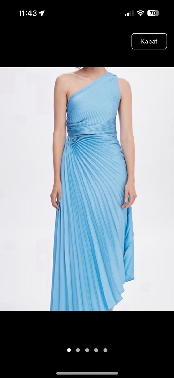 Bu açık mavi, askılı drapeli elbise etnik desenli, bol kesim ve bohem tarzda, şık düğünler için uygun.