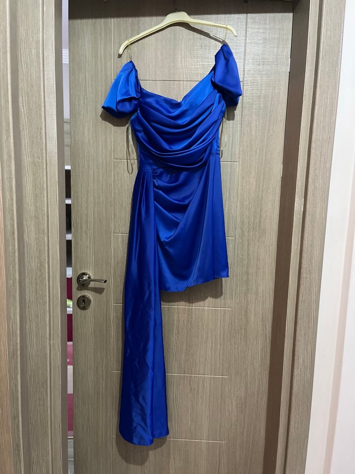 Bu abiye elbise straplez, drapeli detaylara sahip ve parlak mavi renktedir. Kolsuz ve vücuda oturan kesimiyle çağdaş, avangart bir tarz sunar. ✨