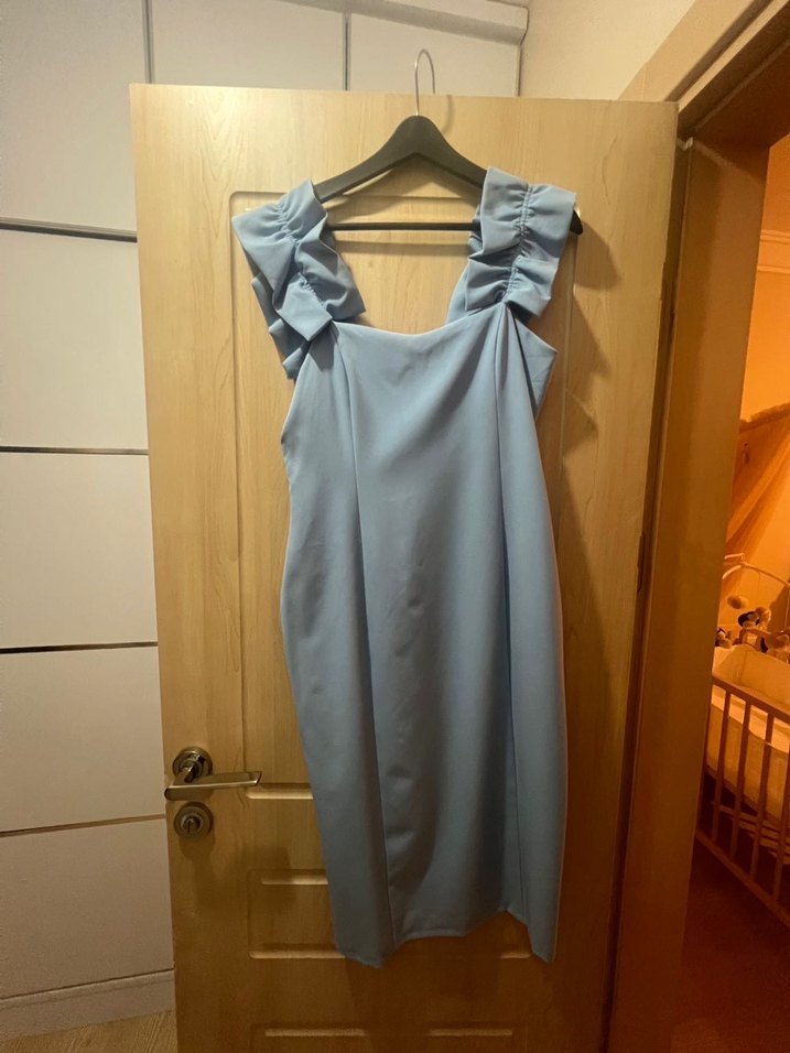 Mavi renkte, drapeli abiye elbise. Kolsuz veya kollu vücuda oturan kesimiyle minimalist sokak stiline uygun.